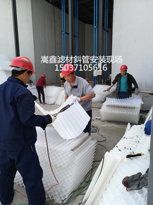 1、打開斜管填料包裝,將第一片斜管填料平放于地面,取第二片斜管填料置于第一片填料之上,檢查斜管填料的切口,必須保證60°角、并呈六角蜂窩狀,檢查無誤后開始燙接粘接點;