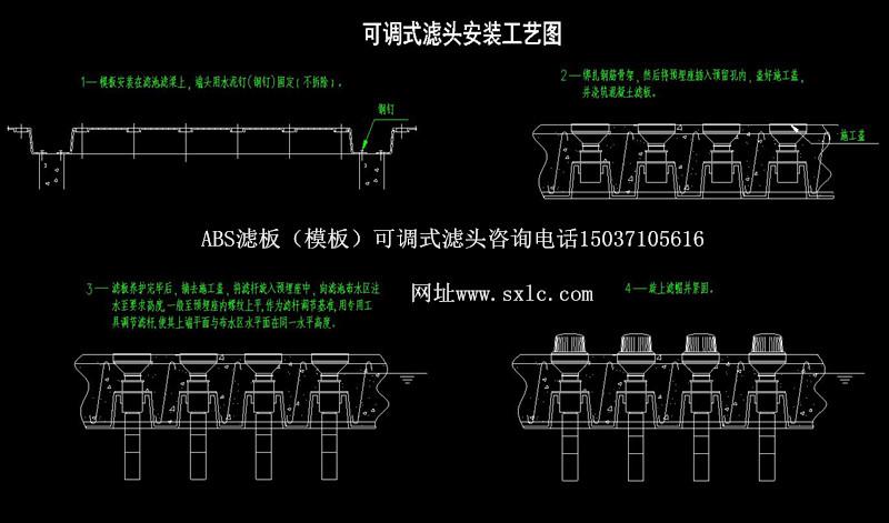 水廠濾池氣水反沖洗濾池常用的濾板有預(yù)制濾板和現(xiàn)澆整體濾板兩種:濾頭分為固定式和可調(diào)式兩種.固定式適應(yīng)于預(yù)制濾板:可調(diào)式長柄濾頭特別適應(yīng)于現(xiàn)澆濾板.也適應(yīng)于預(yù)制濾板.QSK-ll型可調(diào)式長柄濾頭原料采用高強(qiáng)度ABS顆粒樹脂(簡稱ABS工程塑料)經(jīng)高溫?zé)崛苡删苣ゾ叱尚。可調(diào)式濾頭主要用:濾帽、濾桿、預(yù)埋座組成,濾桿上設(shè)有調(diào)節(jié)螺紋,可供上下調(diào)節(jié);且設(shè)有調(diào)節(jié)瓣與預(yù)埋座內(nèi)調(diào)節(jié)瓣防脫條結(jié)合,可控制濾桿調(diào)節(jié)精度,同時(shí)固定其位置。
